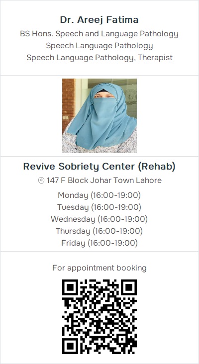 Therapist, Speech & Language PathologistRevive Sobriety Center (Rehab), 147 F Block Johar Town Lahore (1) Contact: 04232186156 , 03405777769